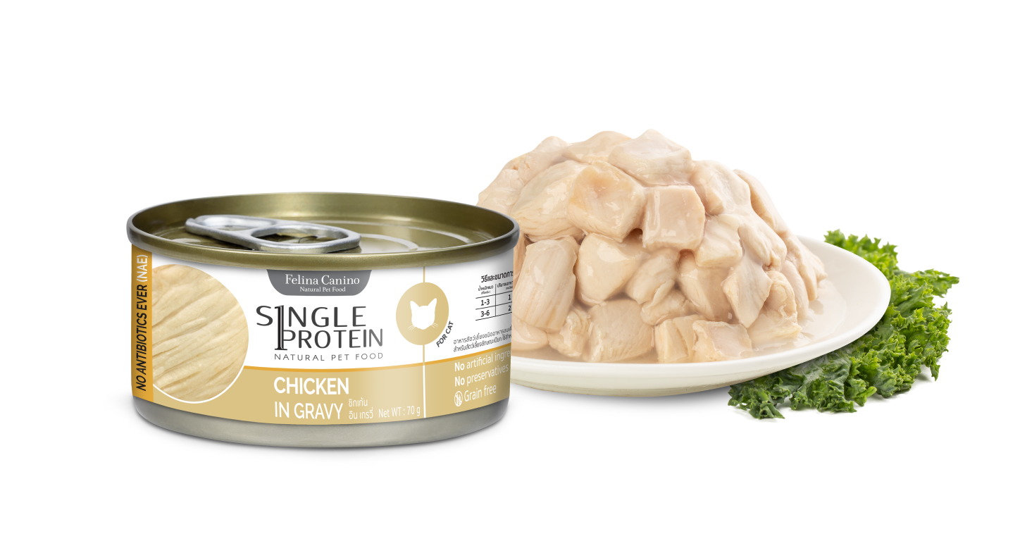 มั่นใจไร้ยาปฏิชีวนะ ผลิตจากเนื้อไก่ที่ผ่านกระบวนการเลี้ยงแบบปลอดยา (No Antibiotics Ever) ลดความเสี่ยงในการปนเปื้อนยาปฏิชีวนะที่อาจก่อให้เกิดอาการแพ้ ได้มาเป็นเนื้อไก่คุณภาพดีแบบเต็มชิ้นเต็มคำในน้ำเกรวี่หอมอร่อย ไม่ผสมโปรตีนจากแหล่งอื่น ไม่มีการปรุงแต่งสารสังเคราะห์ ไม่ใส่เกลือ ได้สารอาหารและรสชาติจากธรรมชาติเต็ม ๆ อัดแน่นอยู่ในรูปแบบกระป๋อง เพียงเปิดและเท ก็สามารถให้แมวอิ่มอร่อยได้ง่าย ๆ